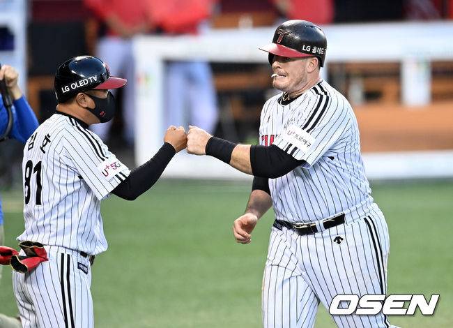 5회말 1사 LG 보어가 추격의 우월 1점 홈런을 날린 뒤 김호 코치의 환영을 받고 있다. 2021.09.18 /cej@osen.co.kr