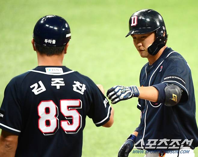 18일 서울 고척스카이돔, KBO리그 두산과 키움 경기. 7회초 무사 1루 박계범이 안타를 치고 나가 축하받고 있다. 고척=정재근 기자 cjg@sportschosun.com/2021.9.18/