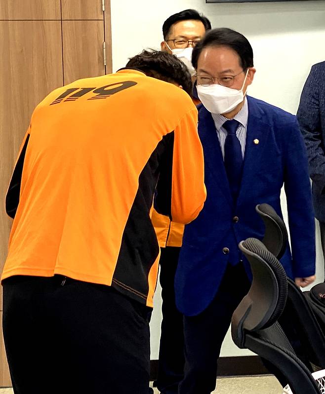 [춘천=뉴시스] 김경목 기자 = 추석연휴 첫날인 18일 허영(춘천철원화천양구갑) 더불어민주당 의원 겸 강원도당 위원장이 강원 춘천시 춘천소방서를 찾아 인사하고 있다. (사진=춘천소방서 제공) 2021.09.18. photo@newsis.com