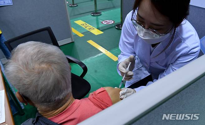 [광주=뉴시스] 변재훈 기자 = 추석 연휴 첫 날인 18일 오전 광주 서구 코로나19 예방 접종센터에서 보건소 의료진이 시민들에게 화이자 백신을 접종하고 있다. 2021.09.18. wisdom21@newsis.com