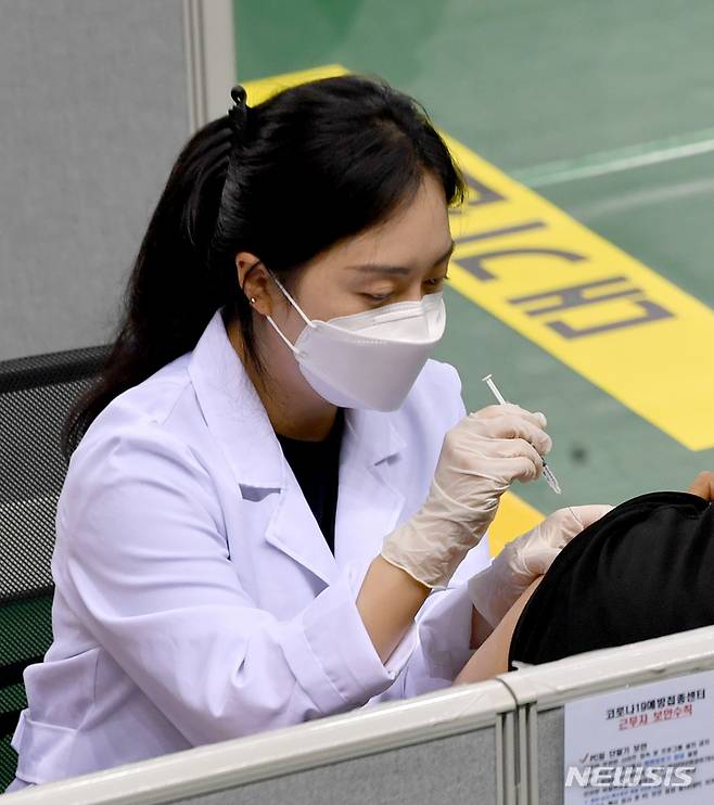 [광주=뉴시스] 변재훈 기자 = 추석 연휴 첫 날인 18일 오전 광주 서구 코로나19 예방 접종센터에서 보건소 의료진이 시민들에게 화이자 백신을 접종하고 있다. 2021.09.18. wisdom21@newsis.com