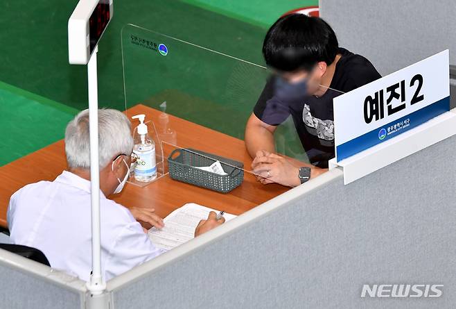 [광주=뉴시스] 변재훈 기자 = 추석 연휴 첫 날인 18일 오전 광주 서구 코로나19 예방 접종센터에서 의료진이 화이자 백신 접종 대상자를 예진하고 있다. 2021.09.18. wisdom21@newsis.com