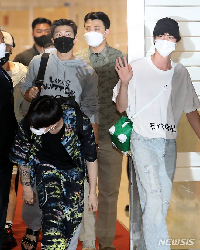 [인천공항=뉴시스] 조성우 기자 = 그룹 방탄소년단(BTS)이 18일 오후 내일(19일)부터 미국 뉴욕에서 열리는 유엔 총회에 문재인 대통령 특별사절 자격으로 참석하기 위해 인천국제공항 제2여객터미널을 통해 출국하고 있다. 2021.09.18. xconfind@newsis.com