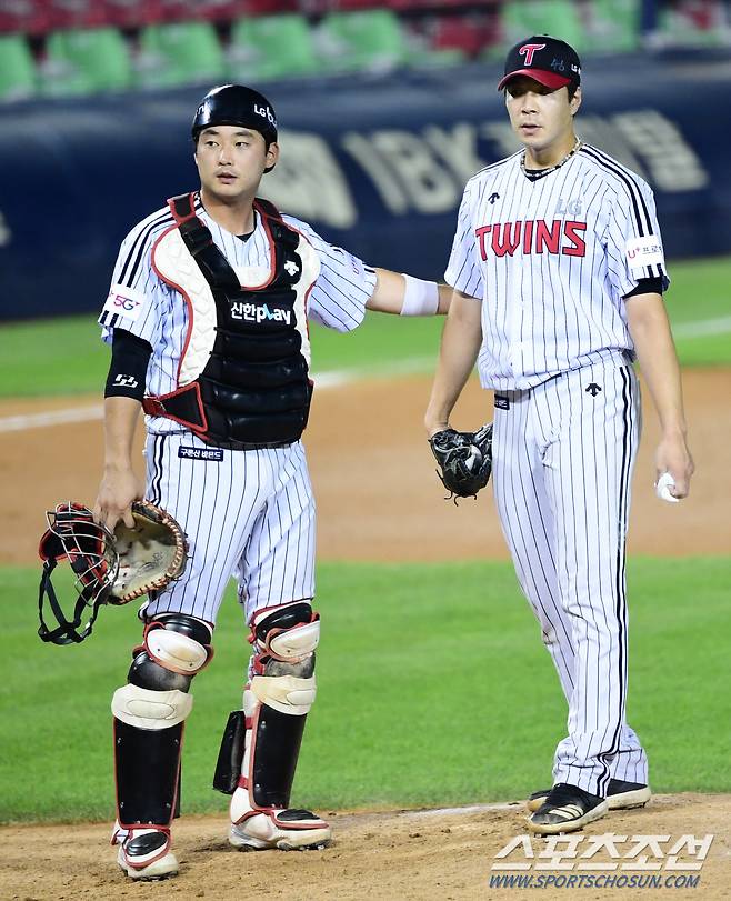 2021 KBO리그 LG트윈스와 KIA타이거즈의 경기가 18일 서울잠실야구장에서 열렸다. LG 투수 김대유가 7회초 1사후 박찬호 타석때 포수 김재성의 방문을 받고 있다. 잠실 =최문영 기자 deer@sportschosun.com /2021.09.18/