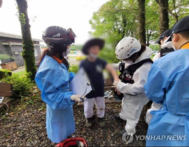 (제주=연합뉴스) 18일 오후 3시 2분께 제주시 오등동 한라산 관음사 코스 5-15지점에서 등반객 28명이 말벌에 쏘이는 사고가 발생했다. 사진은 벌에 쏘인 등반객이 소방 구조대원에 의해 치료를 받는 모습. 2021.9.18 [제주소방안전본부 제공]