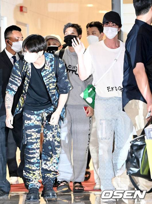 방탄소년단 멤버들이 출국하며 팬들과 취재진을 향해 인사하고 있다. 2021.09.18 / dreamer@osen.co.kr