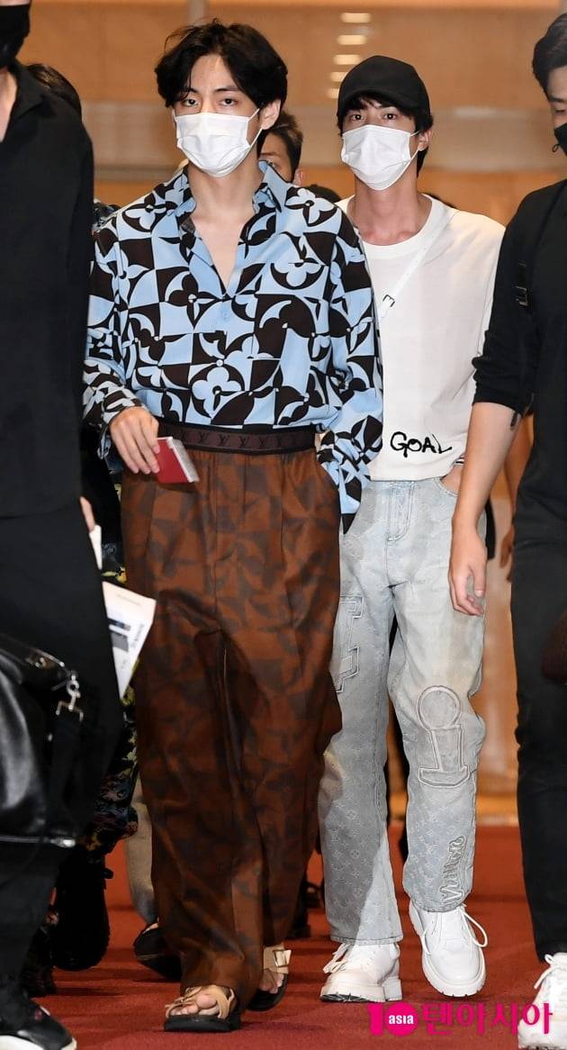 [텐아시아=조준원 기자]그룹 방탄소년단(BTS)(RM, 슈가, 진, 제이홉, 지민, 뷔, 정국) 뷔와 진이 18일 오후 미국 뉴욕에서 열리는 제76차 유엔 총회 참석차 인천국제공항을 통해 출국하고 있다.