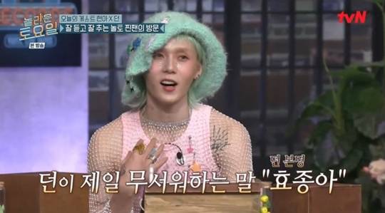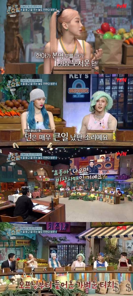 그러면서 "내가 가장 무서워하는 단어가 '효종아'다. 현아가 본명을 부르는 게 무섭다. 혹시 오늘 '효종아'가 나오면 비상사태다"고 털어놨다. 그러자 현아는 던을 귀엽게 꼬집어 웃음을 자아냈다.