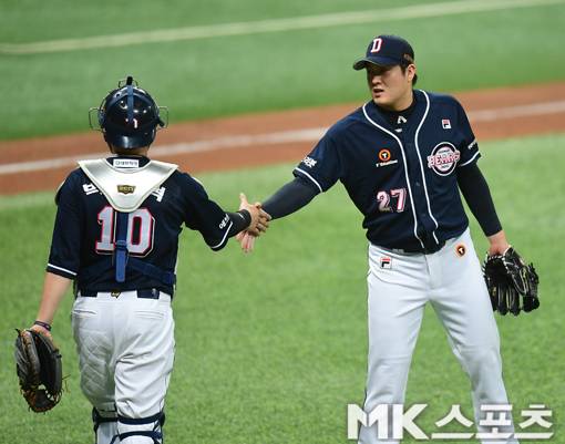두산 김강률과 박세혁이 무승부로 경기를 끝낸 후 기뻐하고 있다.