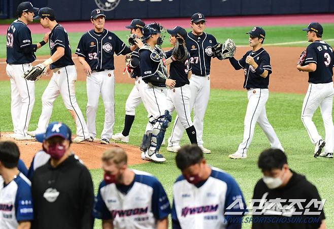 18일 서울 고척스카이돔, KBO리그 두산과 키움 경기. 0-3으로 뒤지던 두산이 7,8,9회 각각 1점씩 뽑아내며 3-3 동점을 만들었다. 9회말 키움이 점수를 뽑지 못해 그대로 3대3 무승부로 경기가 끝났다. 양 팀의 표정이 엇갈리고 있다. 고척=정재근 기자 cjg@sportschosun.com/2021.9.18/