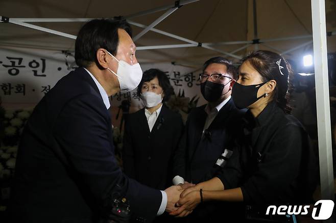(서울=뉴스1) = 윤석열 국민의힘 대선 경선 후보가 18일 서울 여의도 국회 앞에 마련된 자영업자들의 합동분향소에서 자영업자들을 위로하고 있다. (윤석열 캠프 제공) 2021.9.18/뉴스1