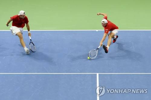 epa09474728 Switzerland's Marc-Andrea Huesler (L) and Dominic Stephan Stricker in action during the Davis Cup World group 2 match 3 against Estonia's Vladimir Ivanov and Mattias Siimar (not pictured), in the Swiss Tennis Arena in Biel, Switzerland, 18 September 2021. EPA/ANTHONY ANEX
