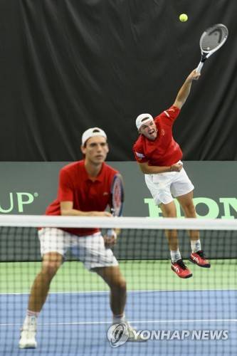 epa09474731 Switzerland's Marc-Andrea Huesler (L) and Dominic Stephan Stricker in action during the Davis Cup World group 2 match 3 against Estonia's Vladimir Ivanov and Mattias Siimar (not pictured), in the Swiss Tennis Arena in Biel, Switzerland, 18 September 2021. EPA/ANTHONY ANEX