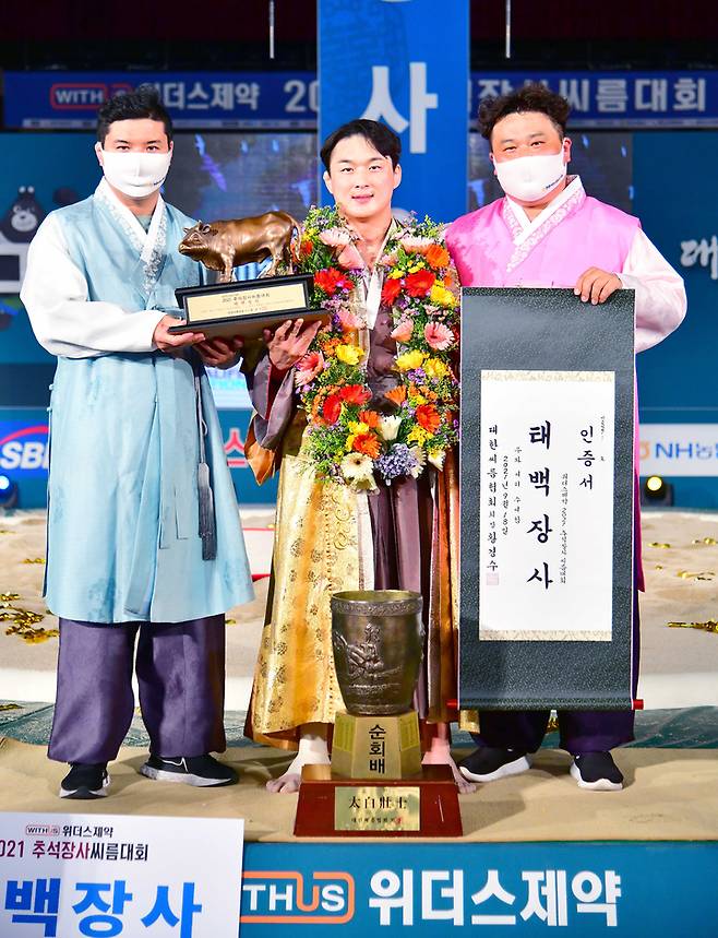 [서울=뉴시스] 조성우 기자 = 18일 충청남도 태안군 태안종합실내체육관에서 열린 '위더스제약 2021 추석장사씨름대회'에서 태백장사(80kg 이하)에 등극한 문준석(수원시청)이 장사 인증서와 황소트로피를 들고 기념사진을 찍고 있다. (사진=대한씨름협회 제공) 2021.09.18. photo@newsis.com *재판매 및 DB 금지