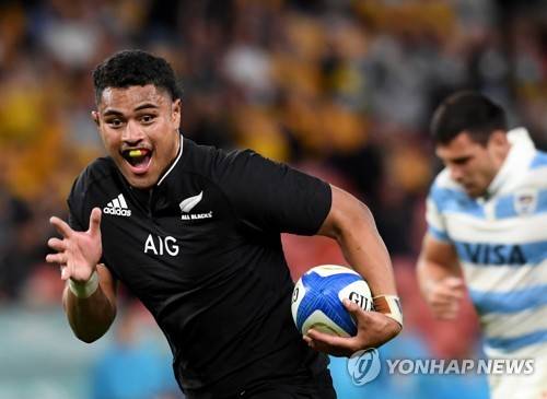 epa09474736 Tupou Vaai of the All Blacks on his way to score a try during the Round 4 Rugby Championship match between the Argentina Pumas and the New Zealand All Blacks at Suncorp Stadium in Brisbane, Australia, 18 September 2021. EPA/DAN PELED AUSTRALIA AND NEW ZEALAND OUT