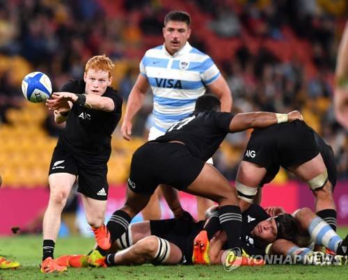 epa09474739 Finlay Christie (L) of the All Blacks in action during the Round 4 Rugby Championship match between the Argentina Pumas and the New Zealand All Blacks at Suncorp Stadium in Brisbane, Australia, 18 September 2021. EPA/DARREN ENGLAND AUSTRALIA AND NEW ZEALAND OUT