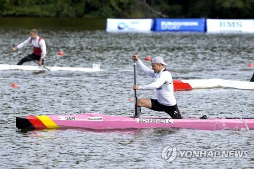 epa09474748 Conrad Scheibner of Germany competes in the Men's Canoe 1000 meter final at the Canoe and Kayak sprint World Championsships 2021 at Bagsvaerd Lake, in Copenhagen, Denmark, 18 September 2021. EPA/Keld Navntoft DENMARK OUT