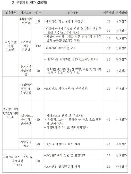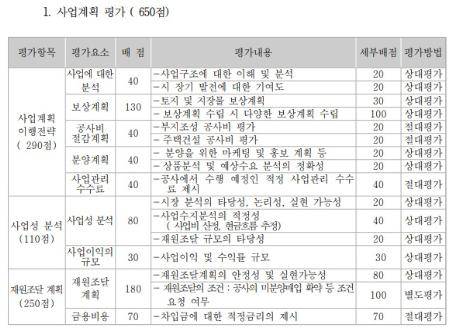 18일 국회 행정안전위원회 소속 최춘식 국민의힘 의원이 입수한 대장동 개발사업 공모지침서에 따르면, 공사는 ‘공모 평가 방법’을 ‘사업계획 평가(650점)’와 ‘운영계획 평가(350점)’로 구분하면서 ‘상대평가’와 ‘절대평가’ 방식으로 평가를 수행하도록 했다.