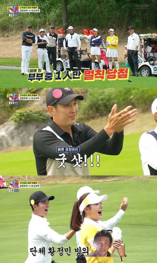 '추석은 자양강장'팀은 더블보기를 기록, '편먹고 공치삼'팀은 보기를 기록하면서 송편 벌칙은 강경준♥장신영 부부가 받게 됐다. 강경준이 누가 봐도 고추냉이인 송편을 골랐고, 괜찮다고 말하면서도 빨개진 얼굴을 보여 웃음을 유발했다.