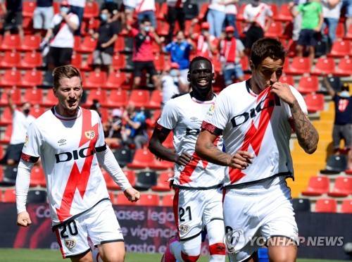epa09474775 Rayo Vallecano's midfielder Oscar Trejo (R) celebrates after scoring a goal against Getafe during their LaLiga soccer match held at Vallecas Stadium in Madrid, Spain, 18 September 2021. EPA/Víctor Lerena
