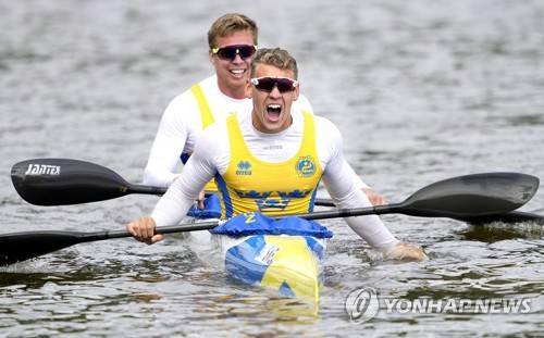epa09474802 Dennis Kernen and Martin Nathelli of Sweden reacts after the Men's K2 kayak 1000 meter final at the Canoe and Kayak sprint World Championsships 2021 at Bagsvaerd Lake, in Copenhagen, Denmark, 18 September 2021. EPA/Keld Navntoft DENMARK OUT