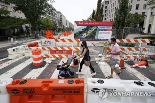A family walks near Black Lives Matter Plaza near the White House in Washington, Saturday, Sept. 18, 2021, where construction is beginning to create a permanent installation. (AP Photo/Steve Helber)