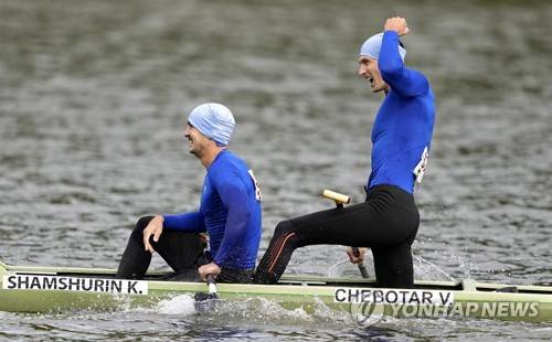 epa09474817 Kirill Shamshurin and Vladislav Chebotar of Russia react after the Mens K2 kayak 1000 meter final at the Canoe and Kayak sprint World Championsships 2021 at Bagsvaerd Lake, in Copenhagen, Denmark, 18 September 2021. EPA/Keld Navntoft DENMARK OUT