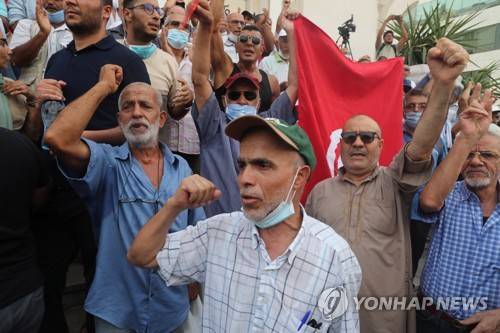 epa09474823 Opponents of Tunisia's President Kais Saied shout slogans as they take part in a protest against what they call his coup on 25 July, in Tunis, Tunisia, 18 September 2021. Tunisian President Saied suspended the country's parliament and dismiss the Prime Minister, Hichem Mechichi on 25 July 2021. EPA/MOHAMED MESSARA
