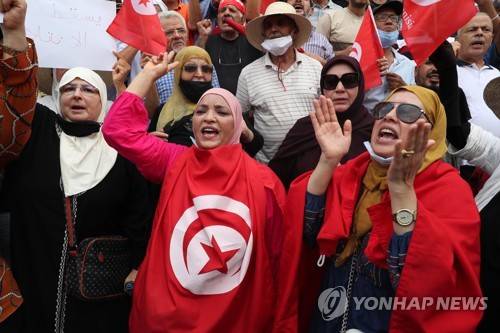 epa09474830 Opponents of Tunisia's President Kais Saied shout slogans as they take part in a protest against what they call his coup on 25 July, in Tunis, Tunisia, 18 September 2021. Tunisian President Saied suspended the country's parliament and dismiss the Prime Minister, Hichem Mechichi on 25 July 2021. EPA/MOHAMED MESSARA