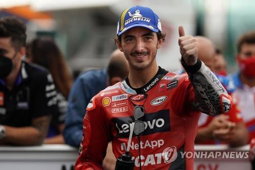 epa09474848 Francesco Bagnaia of Italy, Ducati Lenovo Team, celebrates the pole position in the Qualifying of the Motorcycling Grand Prix of San Marino and the Riviera of Rimini, Misano Adriatico, Italy, 18 September 2021. EPA/DANILO DI GIOVANNI