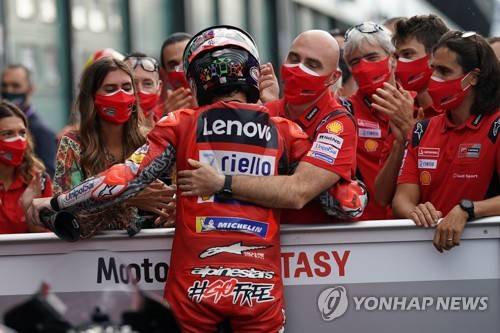 epa09474840 Francesco Bagnaia of Italy, Ducati Lenovo Team, celebrates the pole position in the Qualifying of the Motorcycling Grand Prix of San Marino and the Riviera of Rimini, Misano Adriatico, Italy, 18 September 2021. EPA/DANILO DI GIOVANNI