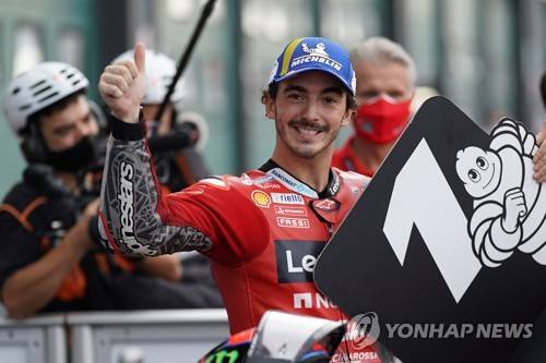 epa09474849 Francesco Bagnaia of Italy, Ducati Lenovo Team, celebrates the pole position in the Qualifying of the Motorcycling Grand Prix of San Marino and the Riviera of Rimini, Misano Adriatico, Italy, 18 September 2021. EPA/DANILO DI GIOVANNI