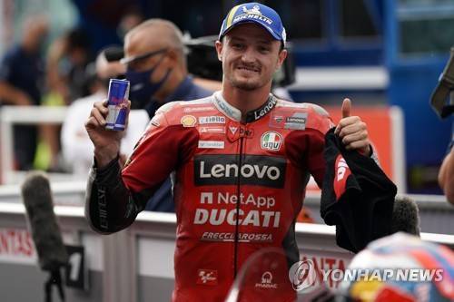 epa09474854 Jack Miller of Australia, Ducati Lenovo Team, celebrates the second place in the Qualifying of the Motorcycling Grand Prix of San Marino and the Riviera of Rimini, Misano Adriatico, Italy, 18 September 2021. EPA/DANILO DI GIOVANNI