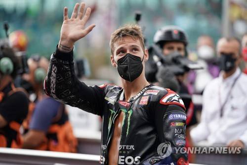 epa09474858 Fabio Quartararo of France, Monster Energy Yamaha MotoGP, celebrates the third place in the Qualifying of the Motorcycling Grand Prix of San Marino and the Riviera of Rimini, Misano Adriatico, Italy, 18 September 2021. EPA/DANILO DI GIOVANNI