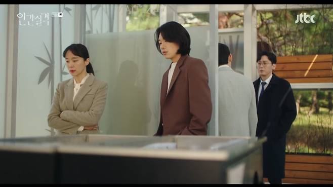 정수는 후배 준혁(강형석 분)과 흡연실 문 앞에서 자판기 커피를 마시며 대화했다. 정수는 "아내가 로비에서 가방만 던져두고 사라졌다. 로비에서 걷다가 화장실에 뭘 두고 갔다고 정신없이 뛰어가더니 안 온다. 누굴 만난건지 두고 온건지 알다가도 모르겠다"고 토로했다.