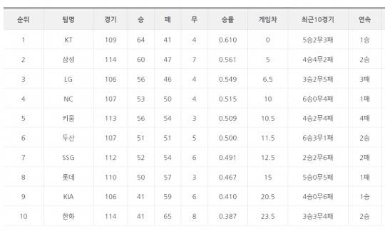 [프로야구 18일 팀 순위]삼성, 선두 kt에 이어 두번째 60승 고지 밟아..3위 LG부터 8위 롯데까지 어느 팀도 승리 챙기지 못해