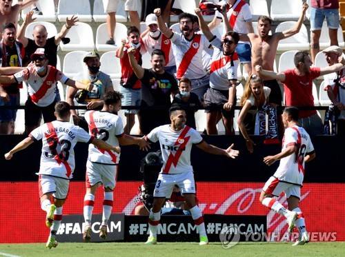 epa09474880 Rayo Vallecano's striker Radamel Falcao (2-R) celebrates after scoring the 0-3 goal during a LaLiga soccer match held at Vallecas Stadium in Madrid, Spain, 18 September 2021. EPA/Victor Lerena