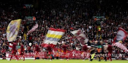 epa09474887 Players of Liverpool enter the pitch before the English Premier League soccer match between Liverpool FC and Crystal Palace in Liverpool, Britain, 18 September 2021. EPA/Tim Keeton EDITORIAL USE ONLY. No use with unauthorized audio, video, data, fixture lists, club/league logos or 'live' services. Online in-match use limited to 120 images, no video emulation. No use in betting, games or single club/league/player publications