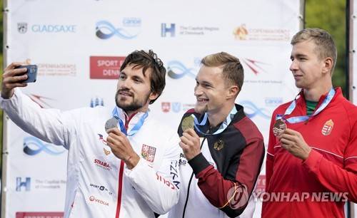 epa09474902 (L-R) Martin Fuksa of the Czech Republic, lConrad Scheibner of Germany, and Balazs Adolf of Hungary celebrate on the podium for the Men's K11000 meter final at the Canoe and Kayak sprint World Championsships 2021 at Bagsvaerd Lake, in Copenhagen, Denmark, 18 September 2021. EPA/Keld Navntoft DENMARK OUT