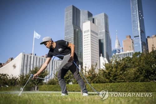 epa09474906 Swiss-French artist Saype (Guillaume Legros) works on his giant ephemeral landart painting entitled 'World in Progress II' representing two children drawing and building with origami their ideal world, at the Headquarters of the United Nations (U.N.) in New York City, USA, 11 September 2021 (issued 18 September 2021). The artwork covering 11'000 square meters was produced with biodegradable paints made from natural pigments such as charcoal and chalk and constitutes the second step of a project started at the U.N. European headquarters in Geneva in 2020. The project is supported and gifted by Switzerland to the U.N. to celebrate the 75th anniversary of the organization and the launch of the Common Agenda. EPA/VALENTIN FLAURAUD