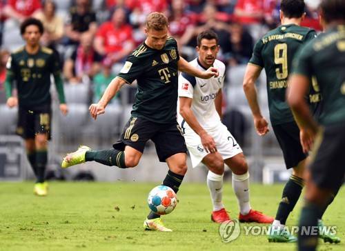 epa09474919 Munich's Joshua Kimmich (C) scores the 2-0 lead during the German Bundesliga soccer match between Bayern Munich and VfL Bochum in Munich, Germany, 18 September 2021. EPA/LUKAS BARTH-TUTTAS (DFL regulations prohibit any use of photographs as image sequences and/or quasi-video)