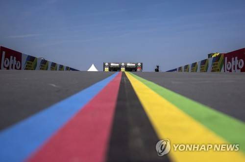 A view of the starting position for the Individual time trial cycling race in Knokke, Belgium Saturday Sept. 18, 2021. The Elite Men Individual time trial will be the opening event of the World Road Cycling Championships in Belgium on Sunday. (AP Photo/Olivier Matthys)