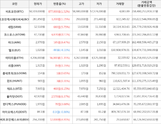 [표]가상화폐 시세 (제공: 암호화폐 거래소 업비트)