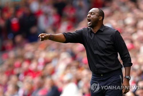 epa09474936 Crystal Palace's manager Patrick Vieira reacts during the English Premier League soccer match between Liverpool FC and Crystal Palace in Liverpool, Britain, 18 September 2021. EPA/Tim Keeton EDITORIAL USE ONLY. No use with unauthorized audio, video, data, fixture lists, club/league logos or 'live' services. Online in-match use limited to 120 images, no video emulation. No use in betting, games or single club/league/player publications