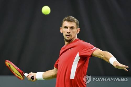 epa09474938 Switzerland's Henri Laaksonen, in action against Estonia's Daniil Glinka during the Davis Cup World group 2 match 4, in the Swiss Tennis Arena in Biel, Switzerland, 18 September 2021. EPA/ANTHONY ANEX