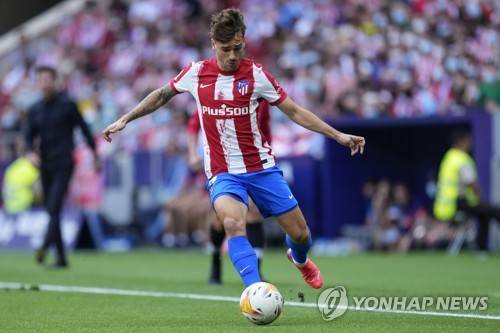 Atletico Madrid's Antoine Griezmann goes for the ball during a Spanish La Liga soccer match between Atletico Madrid and Athletic Bilbao at Wanda Metropolitano stadium in Madrid, Spain, Saturday, Sept. 18, 2021. (AP Photo/Manu Fernandez)