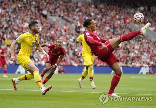 epa09474959 Virgil van Dijk (R) of Liverpool in action against Joel Ward (L) of Crystal Palace during the English Premier League soccer match between Liverpool FC and Crystal Palace in Liverpool, Britain, 18 September 2021. EPA/Tim Keeton EDITORIAL USE ONLY. No use with unauthorized audio, video, data, fixture lists, club/league logos or 'live' services. Online in-match use limited to 120 images, no video emulation. No use in betting, games or single club/league/player publications