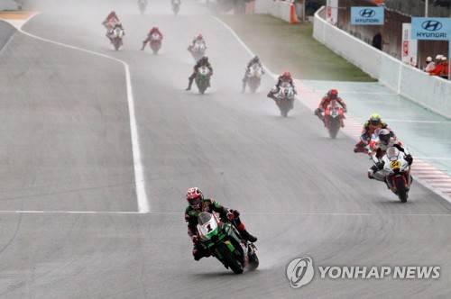epa09474965 British Superbike rider Jonathan Rea (C) of Kawasaki Racing Team Worldsbk in action during the Hyundai N Catalunya WorldSBK Round 2021 held at Montmelo racetrack in Barcelona, Spain, 18 September 2021. EPA/Alejandro Garcia