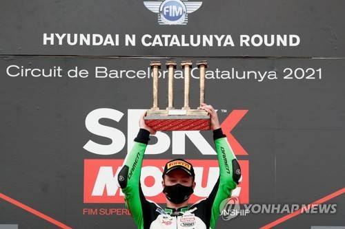 epa09474963 Dutch supersport 300 rider Jeffrey Buis of MTM Kawasaki team celebrates his victory following the Hyundai N Catalunya WorldSBK Round 2021 held at Montmelo racetrack in Barcelona, Spain, 18 September 2021. EPA/Alejandro Garcia