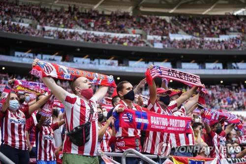 Atletico Madrid fans hold up their scarves and chant prior to a Spanish La Liga soccer match between Atletico Madrid and Athletic Bilbao at Wanda Metropolitano stadium in Madrid, Spain, Saturday, Sept. 18, 2021. (AP Photo/Manu Fernandez)